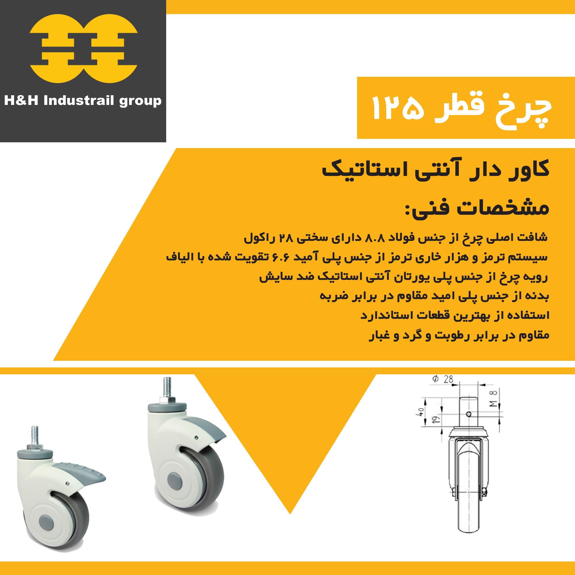 بیشترین مصرف این چرخ در صنعت بیمارستانی و با توجه به سایز آن در تخت های بستری بیمارستان می باشد که با توجه به اینکه ترمز از جنس پلی آمید 6.6 الیاف دار می باشد در عین سختی و استحکام بالا ترمز به راحتی و نرمی امکان ترمز گرفتن وجود دارد همچنین جنس رویه لاستیک چرخ پلی یورتان می باشد که همین امر موجب به آن شده است که رویه لاستیک با توجه به استفاده مکرر و دائم در بیمارستان ها هیچ گونه آسیبی نبیند و این محصول کاملاً ایرانی بوده و با اطمینان از کیفیت چرخ گروه صنعتی اچ اند اچ به مدت 30 ماه این چرخ را گارانتی دائم برای اطمینان خاطر مشتریان می نماید.